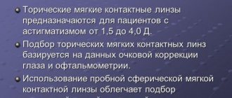 Астигматизм — изменение формы роговицы или хрусталика, в результате которого на разных меридианах получается различная преломляющая сила. Это приводит к искажению изображения и общему ухудшению качества зрения. КО для астигматиков имеет специальную торическую форму и обладает специфическими параметрами: